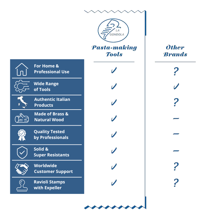 Unsere professionellen Pasta- und Ravioli-Werkzeuge werden entwickelt und getestet, um Ihnen die beste Qualität auf dem internationalen Markt zu garantieren. Es handelt sich um Produkte „Made in Italy“, die die Tradition und Werte ihres Herkunftslandes widerspiegeln und respektieren.
